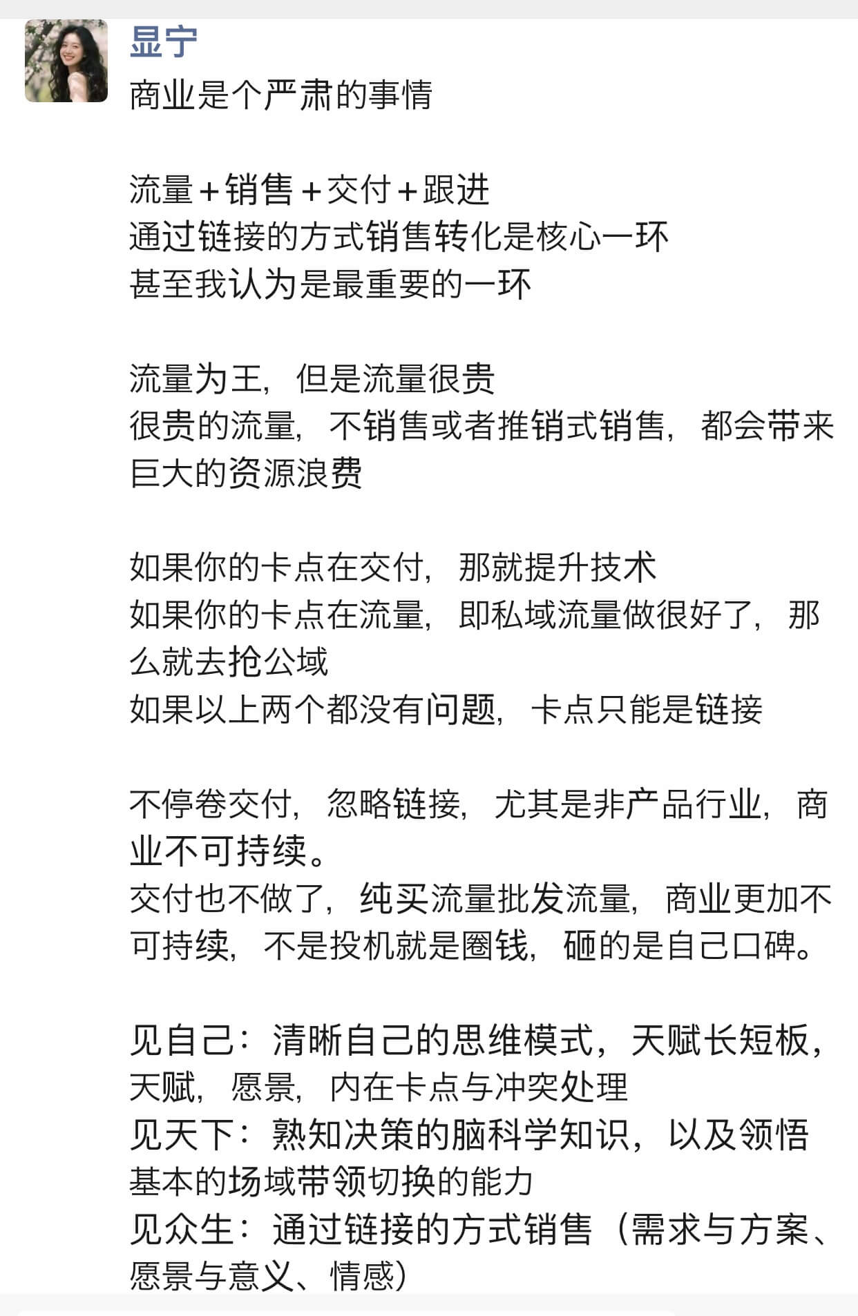 - 与他人建立真实的连接,将对方的痛点/需求与自己的方案匹配,顺其自然地销售成单。