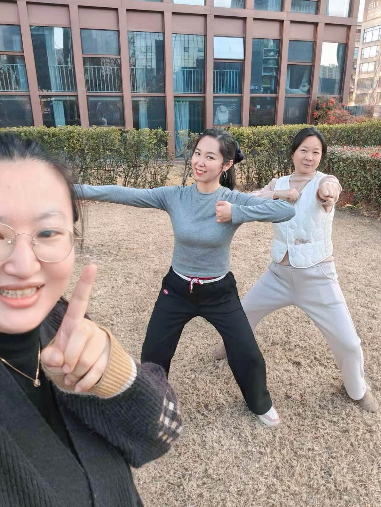 从「双手托天理三焦」到「左右开弓似射雕」,大家认真投入,彼此参照、互相调整。